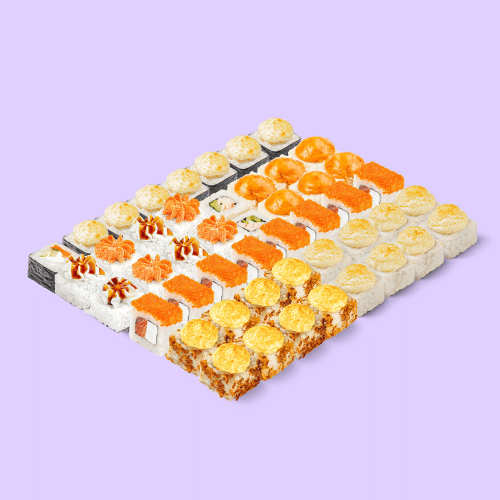 "Чикуби — это жаркий взрыв запечённых вкусов для тех, кто любит погорячее! Состав: Запечённый с лососем, Запечённый с жареным лососем, Запечённый с курицей, Запечённый с крабом, Лосось с тобико оранж, Лава краб. "