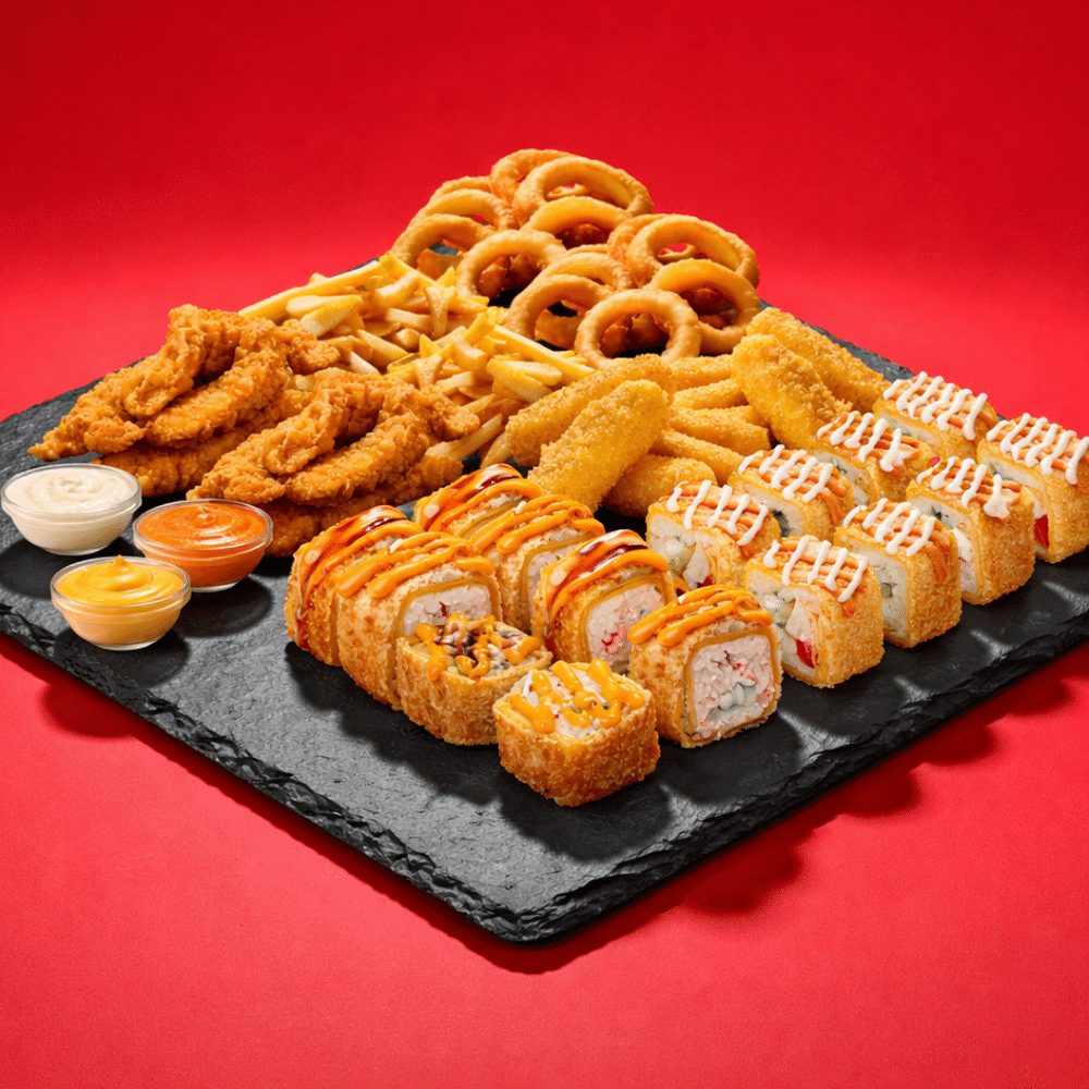Огромный сет, чтобы наесться по-настоящему! Состав: Луковые кольца *2, Стрипсы куриные *2, Сырные палочки* 2, Цезарь БИГ, Краб темпура. Соусы Цезарь, Спайс, Сырный