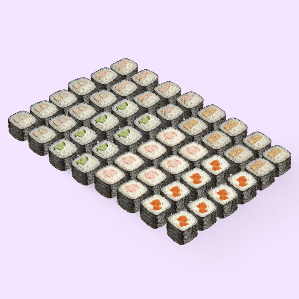 Когда хочется только маки и ничего лишнего. Шесть разных чиз маки в одной коробке — чисто по делу. Состав: Чиз маки с огурцом, Чиз маки с курицей, Чиз маки с краб, Чиз маки креветка, Чиз маки лосось, Чиз маки омлет