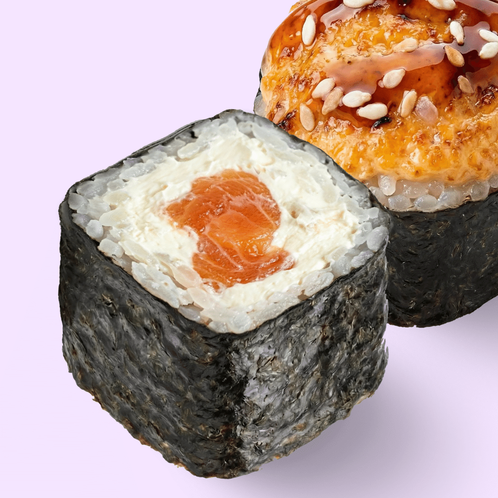 Ролл с обильной порцией лосося и сливочного сыра, запечённый сверху. Состав: нори, рис, лосось, сливочный сыр, запечённая шапка, унаги соус, кунжут