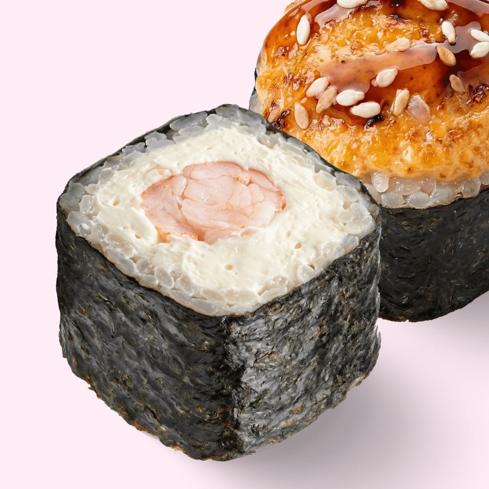 Сытный ролл с креветкой, сливочным сыром и запечённым верхом. Морской вкус и сливочная нежность в одном ролле. Состав: нори, рис, креветка, сливочный сыр, запечённая шапка, унаги соус, кунжут